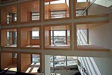 The same materials used for the exterior are used for the interior. The central cores of stability and elevators, as well as the canopy and entrance, were all fi nished with sand-coloured, rough limestone. In this natural stone 'sculpture', slipcases made of Western Red Cedar were placed in a steel framework. This is where the 'centre' of the building is located, housing the actual library with its floors containing the total collection of books. In the western façade, this wall transforms, as it were, into a 'ladder'. To the inside, the wall opens up as slipcases, now finished with American maple. The spaces thus created in the wall have a secluded air and provide a magnificent panorama of the city.