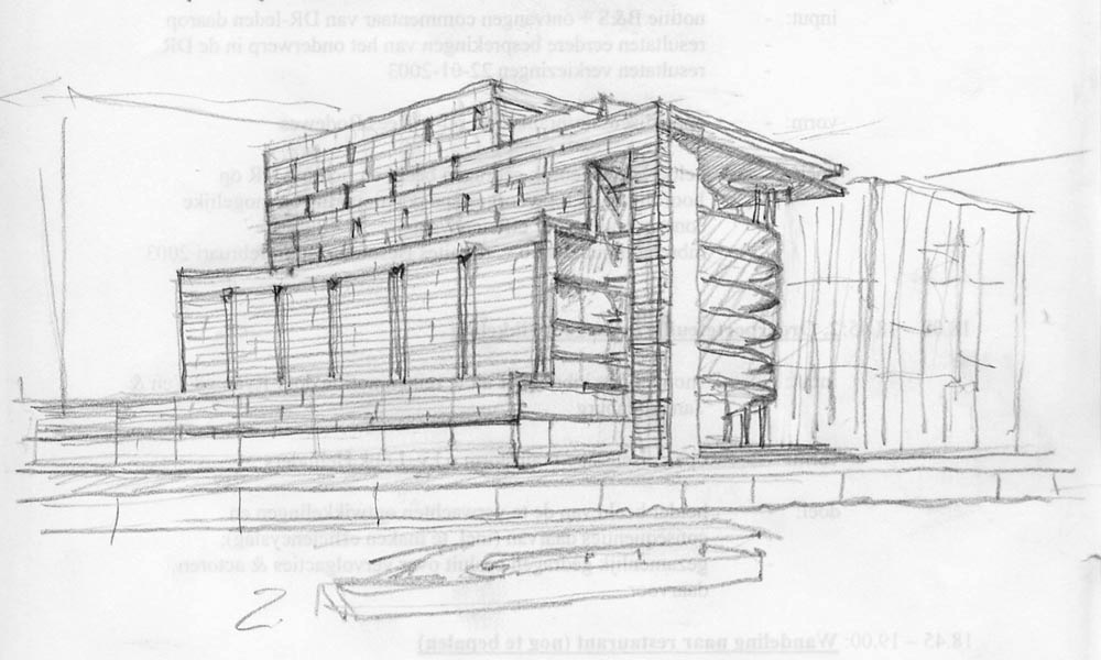 To accommodate the vast array of books representing many centuries of our culture in a multi-functional public building designed to be an exciting, adventurous place to visit." Building a library is a classic example of an assignment that does NOT primarily require making a composition of the exterior of a building, a collection of façades, but rather mainly requires designing the interior world of the building. 'The building and the interior are intricately connected'. For this reason, Jo Coenen not only wanted to design the building, but also its interior. The assignment was to build a stacked-up, envelope-shaped building of 28.500 square meters, in compliance with existing urban development plans, with a volume consisting of a height of 40 m, a width of 40 m and a length of 120 m, approximately.
